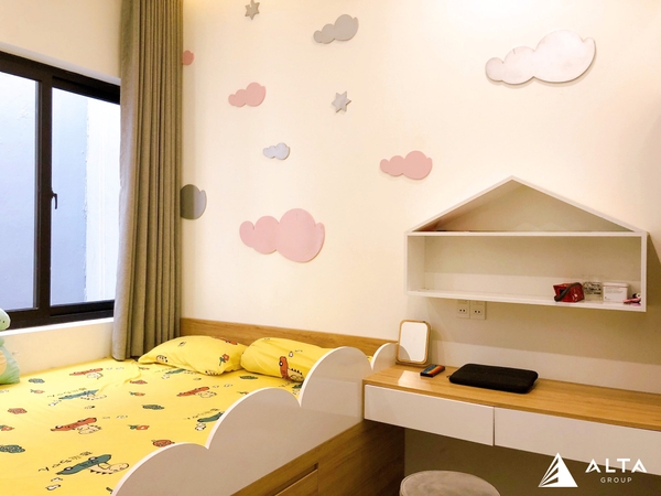 Phòng ngủ cho trẻ với tone màu hồng - trắng, tươi trẻ và đáng yêu cùng những họa tiết hình mây được trang trí trên tường vui nhộn và bắt mắt. Đồ nội thất được thiết kế hiện đại với các đường cong uốn lượn, màu sắc đơn giản mang đến cái nhìn đẹp tinh tế và đặc biệt là hạn chế những nguy hiểm có thể tác động đến trẻ nhỏ.
